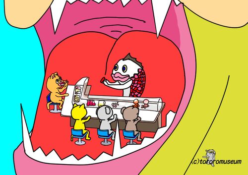 いのちをカケて ショクムをすいこうするヒトビト ここにも いのちをカケて ジュウジするものがいる モウジュウのクチのなかで すしやをイトナンデいる …このタイがそーだ! カレはヒビ いのちをかけている 『口腔自営タイ』だ!!