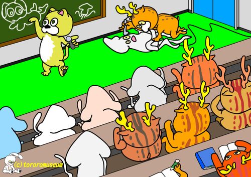 このまなびや たてものじゅう いしゅうが! けものしゅうと なまぐささが こんぜんいったいとチョーワ💦 こうしはネコ …このかおりでおなかがすいて きていることはまちがいない! この イカとシカだらけのがっこう イカシカだいがくです! ……めいもんですねぇ💦