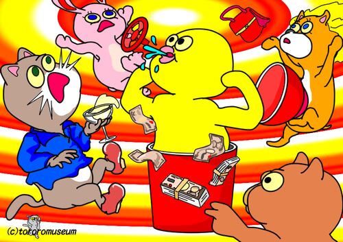 ひとむかしまえ ニホンはバブルの まっただなか ケーキがよく たいきんをかせいで むだづかいのまいにち とうぜん ふくらんだものは しぼむのがヨのつね バルブがはじけとんだ!! ……バブルがはじけたの まちがいでした💦