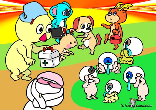 おいおい メダマがいるぞ! ……💦 なんかイタがってるぞ! お~ ぐうぜ~ん💡 看護シカップルが 通りかかったぞ!? 助かったな💛 この場にでくわしたみんな イタイ目にあってしまつたな💦