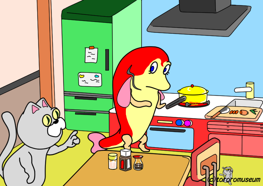 2017-10-24 どこにでもある家庭 ゆうはんどきのキッチン どこにでもいるみなれたキョダイギョが チョ-リらしきことをしている ダンナらしきじんぶつが こんだてを かくにんしにきたようだ💡 ところで このどこにでもいる ありふれたキョダイギョ ……つねにイエにいて カジをヤリ ダンナのせわをする しんせつで しんせんみずみずしい キョダイギョ かのじょは センギョしゅふだ!!