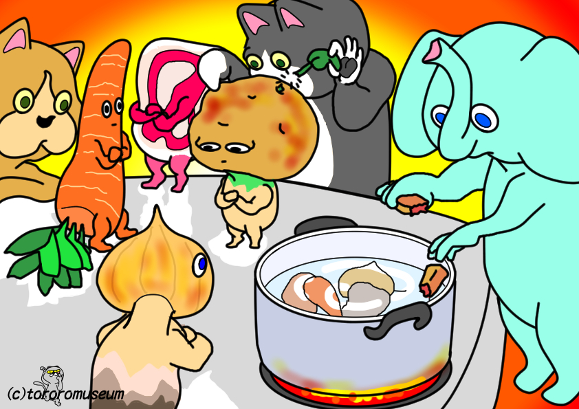 2018-02-05 華麗なる一族 ここに あつまる ソーソーたるメンバー どこのウマのホネか わからないブタ肉 そこらへんで売られている ニンジン・ジャガイモ あまりもののタマネギ さぁ オオシバ(ルー)を入れれば 準備完了! きょう おあつまりのみなさまは カレーになる一族 でございます💛